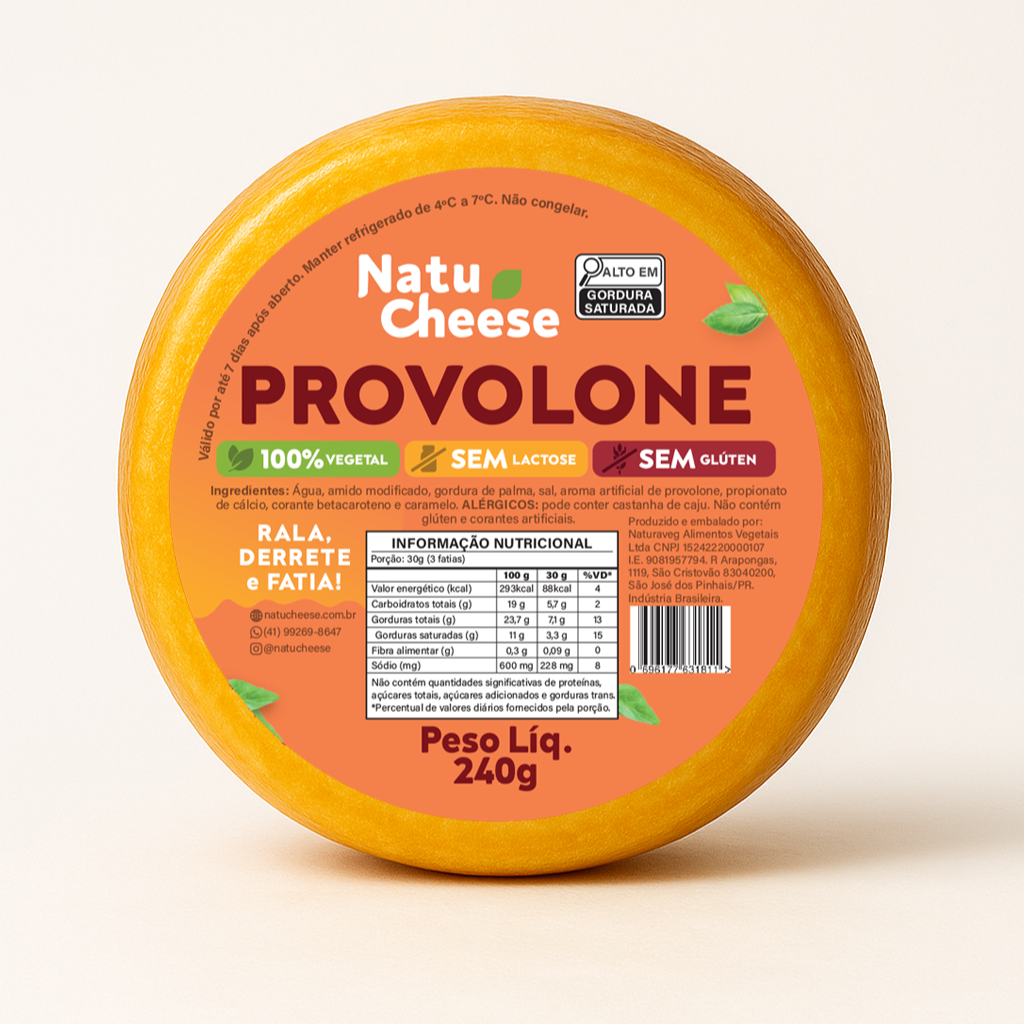 INGREDIENTES: Água, amido modificado, gordura de palma, sal, aroma artificial de provolone, propionato de cålcio, caramelo e betacaroteno.